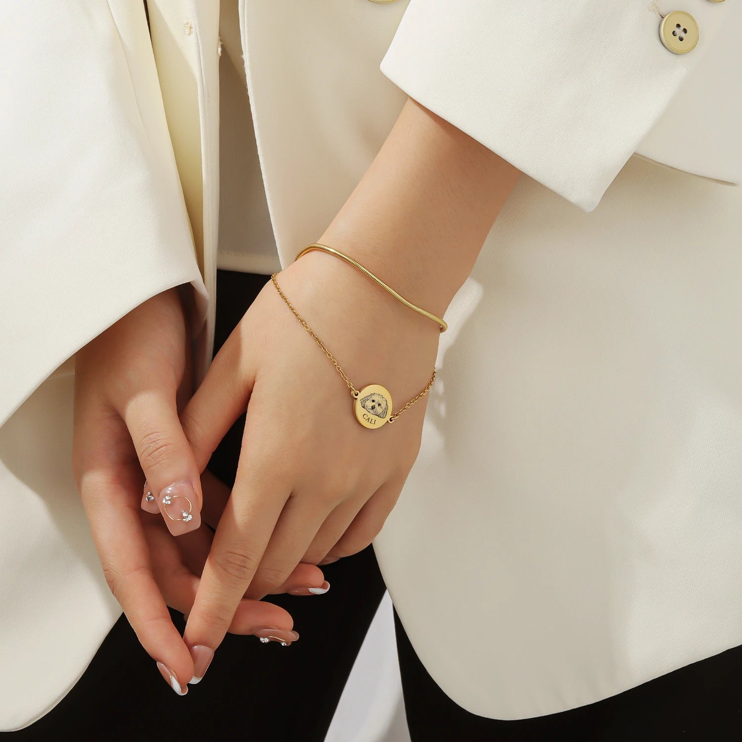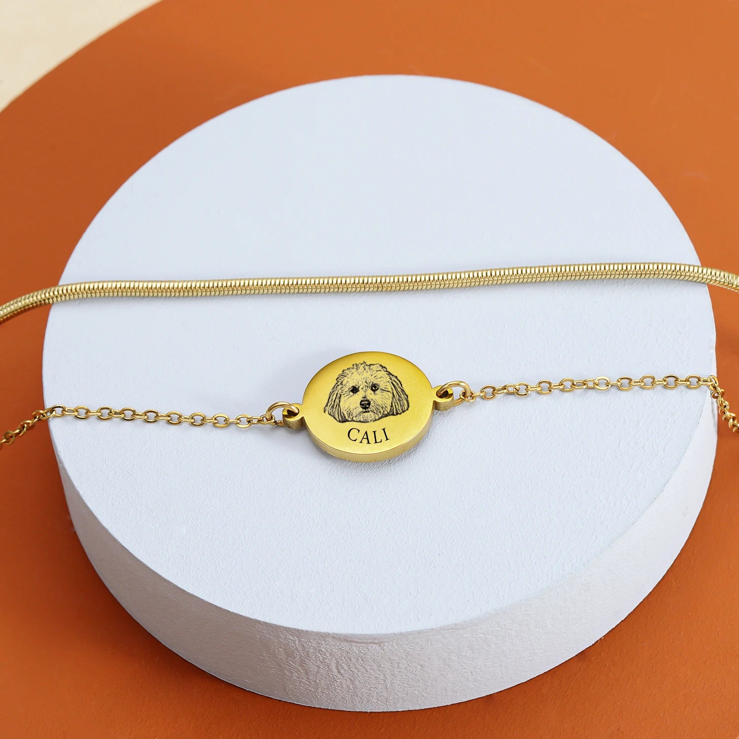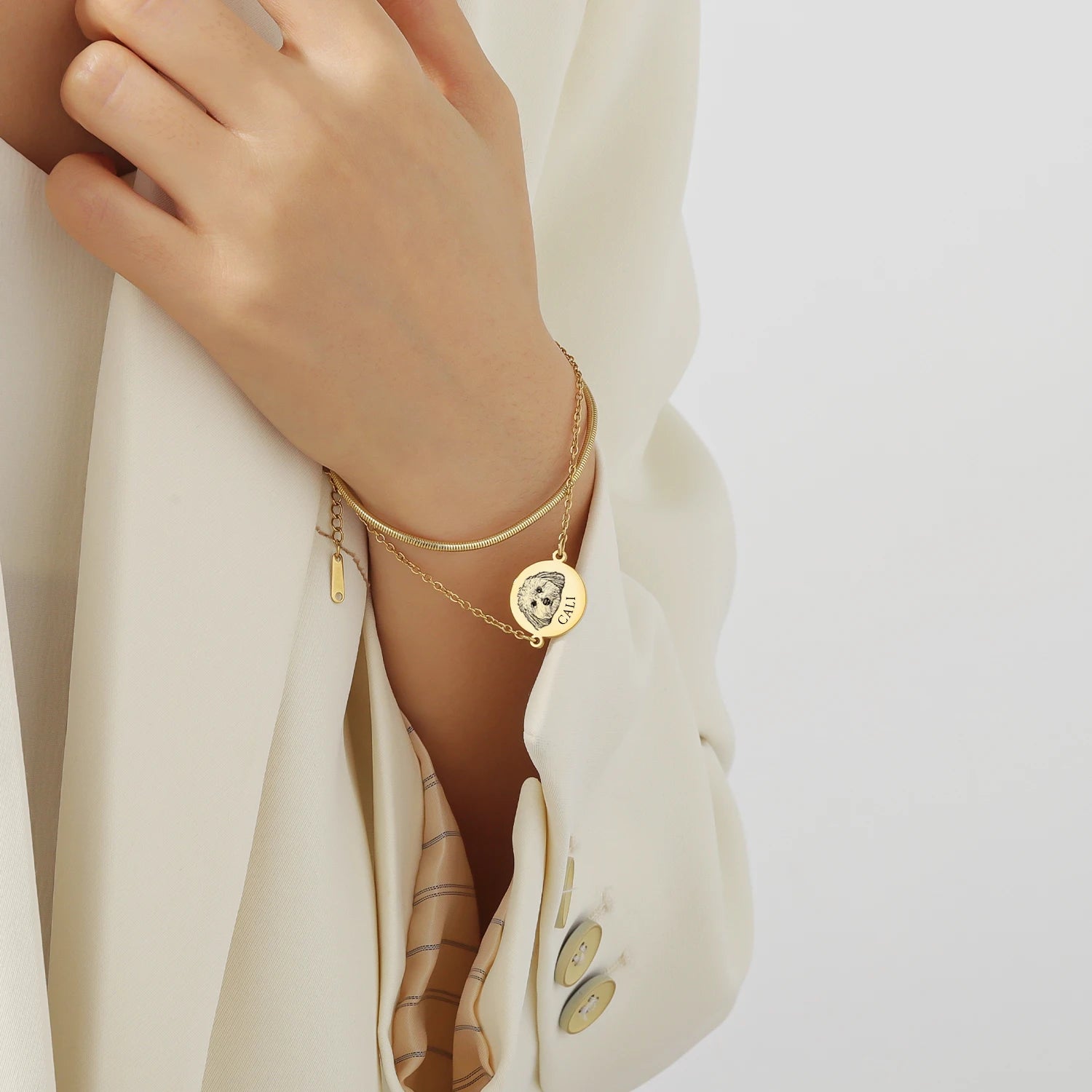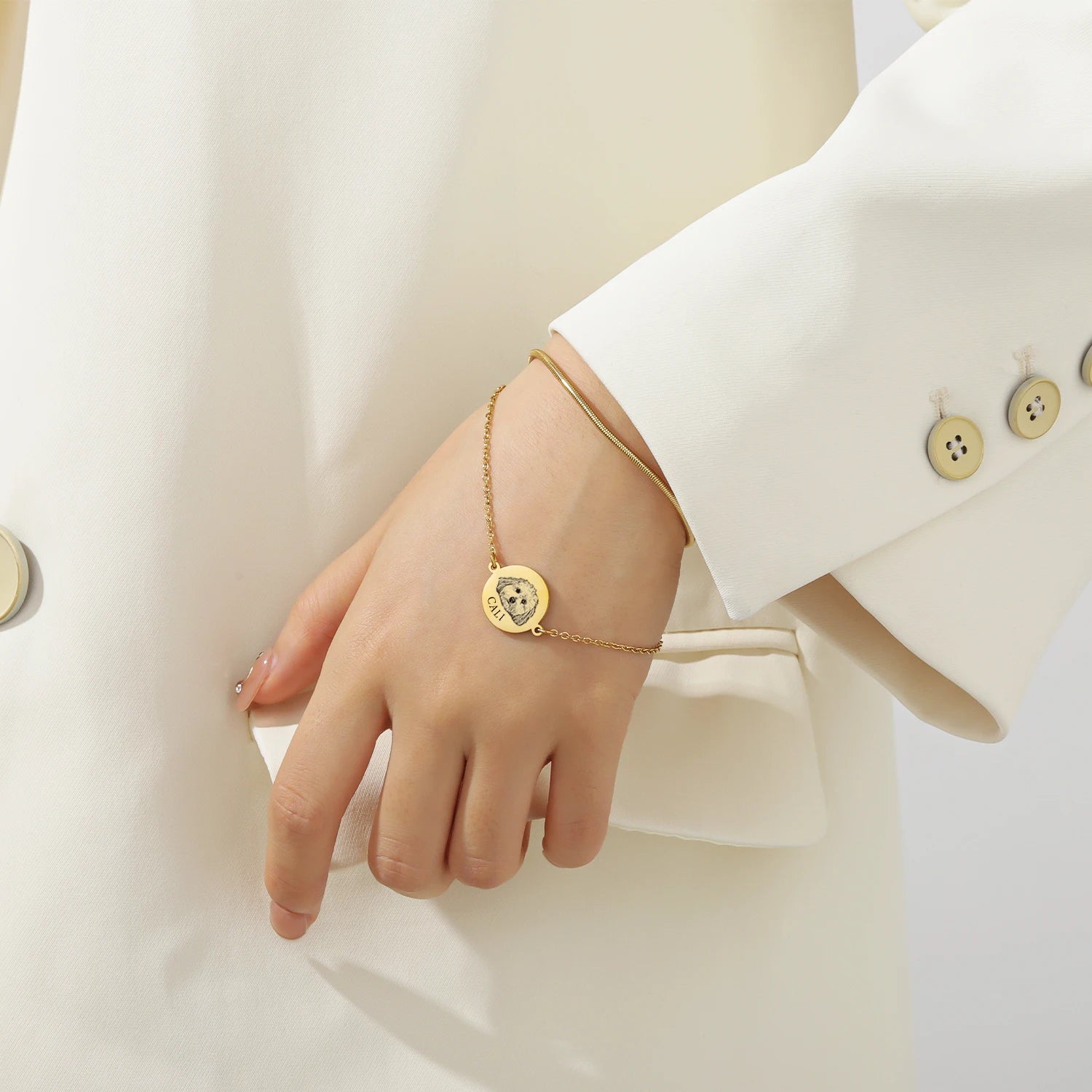 Keep a beloved companion forever close with this beautifully crafted custom portrait bracelet. A favorite photo is transformed into a detailed, elegant engraving, capturing the unique spirit of a cherished pet. The design features a sophisticated double chain. It pairs a smooth snake chain with a delicate link chain for a modern, layered look. This piece is a heartfelt tribute to the joy and love a pet brings into our lives, making it a perfect memorial or a treasured personal keepsake.