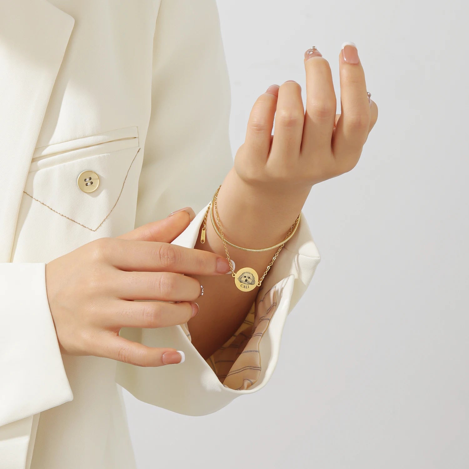 Personalized Pet Portrait Disc with Name Double-Chain Bracelet