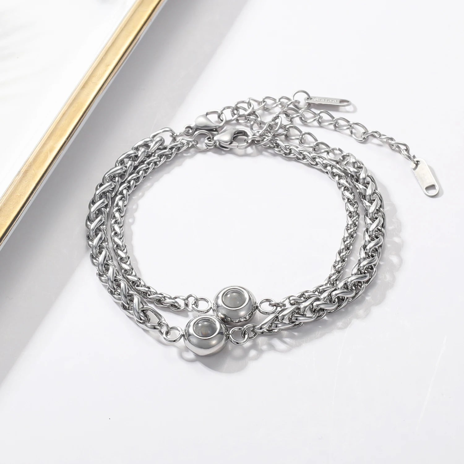 Hold a precious memory in a secret, intimate way with this custom photo projection bracelet. At its center, a sleek charm holds a hidden picture of your choice, revealed only when you look closely or shine a light through it. This modern bracelet, crafted with a durable keel chain, is a unique and deeply personal way to keep a loved one close. Available as a set for couples or individually, it is a meaningful gift that turns a favorite photo into a wearable secret, celebrating your unique bond in a way that only you can share.